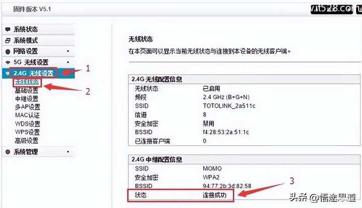 点击“2.4G无线设置”——>“无线状态”——>查看右侧“2.4G中继配置”选项下的“状态”选项,如果“状态”选项后面显示:连接成功,如下图所示,说明TOTOLINK路由器的无线中继设置成功。