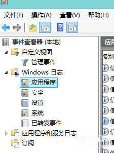 4、接着在看到弹出来的界面时,找到左侧栏目的windows日志,然后点击展开选择应用程序。