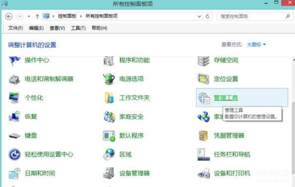 2、接着在控制面板里面设置查看方式为大图标,然后找到管理工具点击进入。
