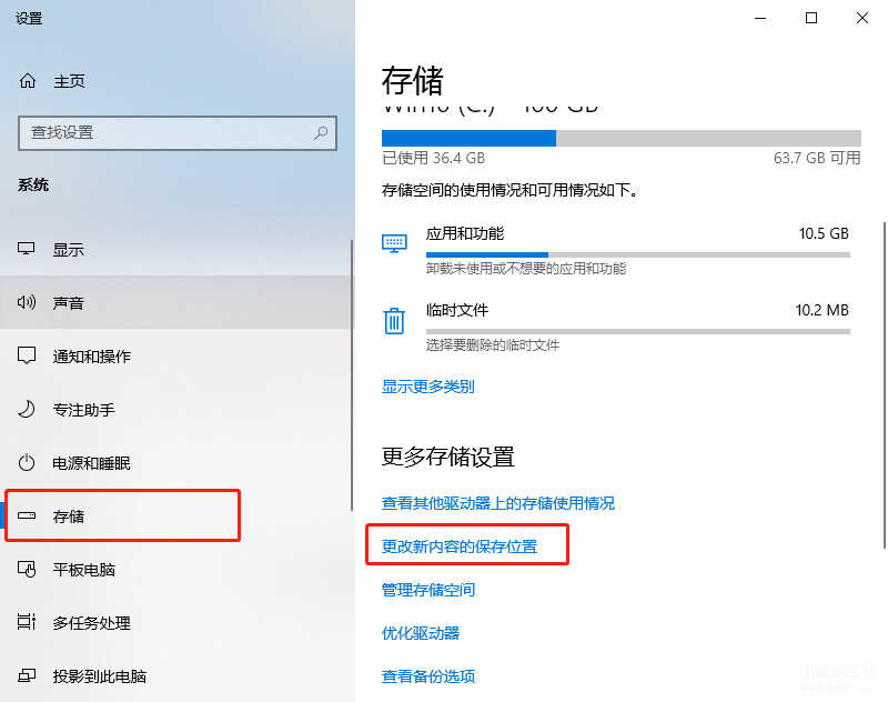 一、桌面鼠标右键选择显示设置——>存储——>更改新内容的保存位置