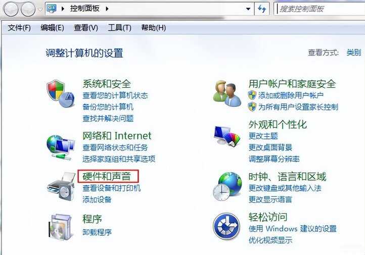 1、打开开始菜单点击控制面板,在窗口中,点击硬件和声音,如下图所示: