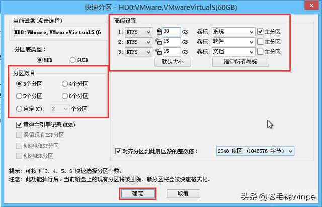 第五步:默认分区表类型为MBR,设置分区数和分区大小,并勾选“对齐分区到此扇区数的整数倍”进行4K对齐,最后点击“确定”