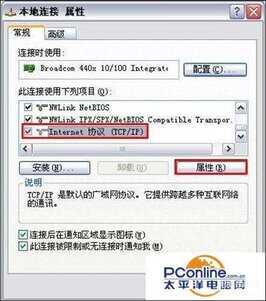 2、是电脑IP地址的设置,路由器默认已近开启DHCP服务,所以我们把电脑IP设置成自动获取就可以了。方法是:右键单击“网上邻居”——“属性”——右键单击“本地连接”——“属性”出现如下窗口: