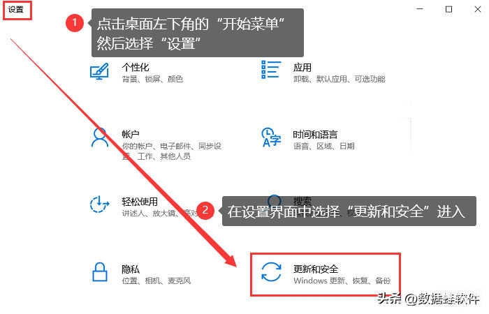 步骤1:单击电脑桌面左下角的【开始菜单】,在弹出的界面选择【设置】,之后找到并点击【更新和安全】;