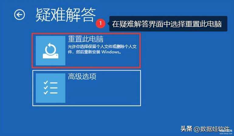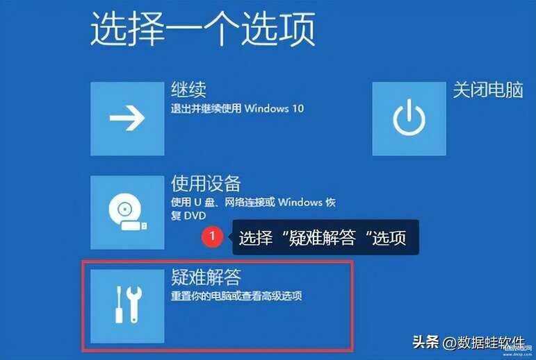 步骤1:按下电脑的开机按钮,等到出现开机图标后,长按电脑的【电源键】以强制关机。重复三次后,将出现自动修复界面。选择【高级选项】。在弹出窗口中,选择下面的【疑难解答】;