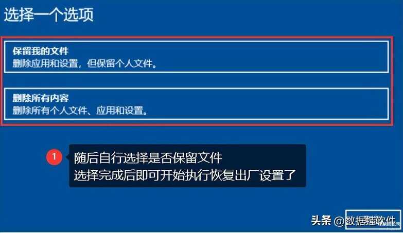 步骤3:这时同样弹出选择的页面,根据自己的需要来选择其中一个选项。选择完成,开始恢复电脑的出厂设置。