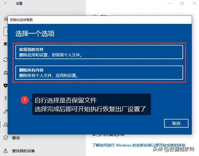 步骤3:这是会弹出一个窗口,里面有两个选项可供选择,根据自己的需要选择是否要保留文件。选择好后,就可以开始恢复出厂设置了。