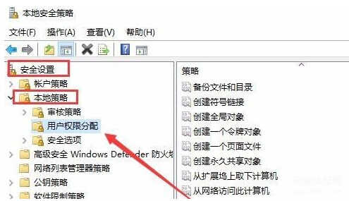 3、再本地安全策略的窗口内,在左侧栏目按照安全设置-本地策略-用户权限分配的配置点击打开。