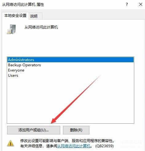 5、接着在从网络访问此计算机的属性窗口中点击添加用户或组进去。