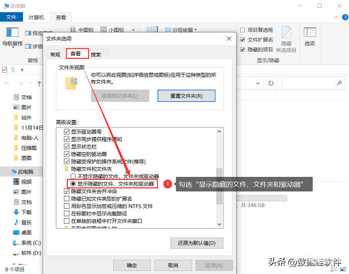 步骤2:再点击【查看】,并下拉找到【显示隐藏的文件、文件夹和驱动器】,勾选这个选项。点击【确定】后,就可以查看文件的扩展名称了。