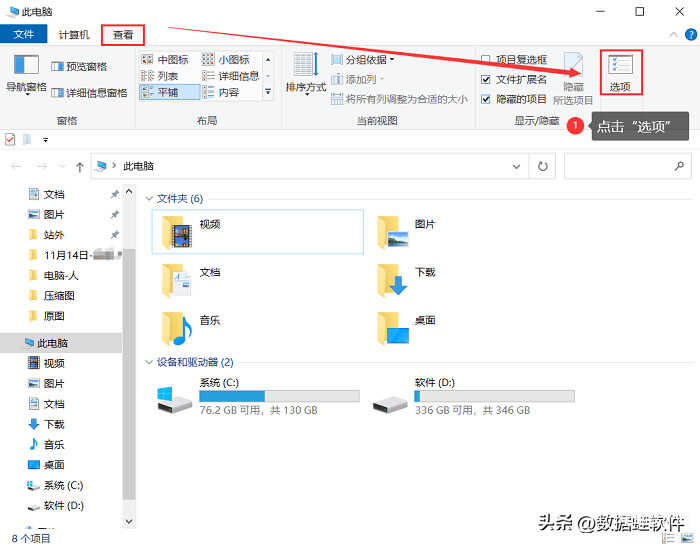 步骤1:打开电脑桌面的【此电脑】,找到【查看】选项里面的【选项】,并点击;