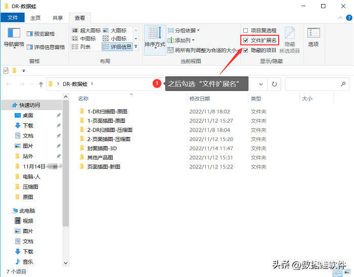 步骤3:你可以在展开的列表里看到【文件扩展名】,这时只需要勾选这个选项,就可以显示文件的扩展名称了。