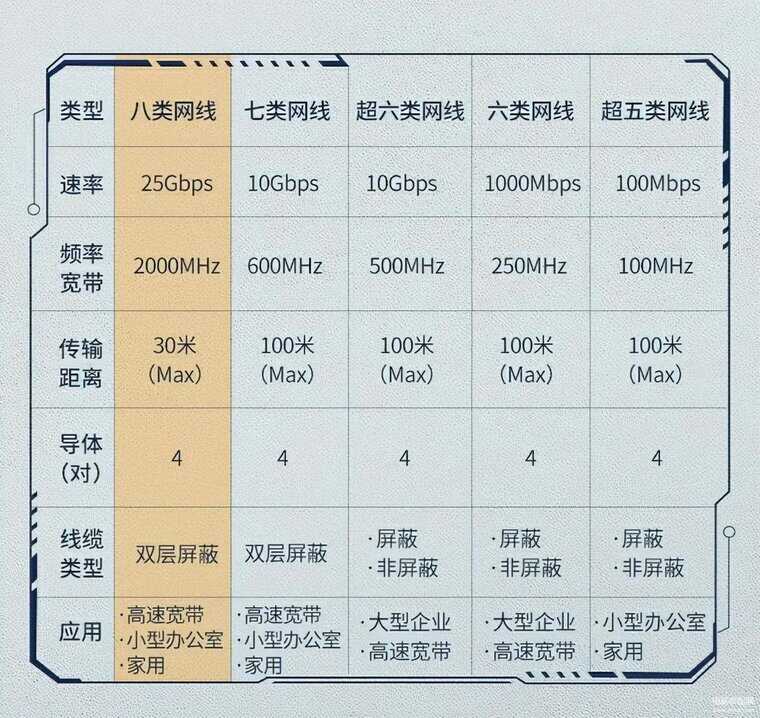我们常用的网线分为:5类线,超5类线,6类线和超6类线四种,下图是几种不同类网线的详细参数。五类线因为达不到家里宽带传输速度,已经逐渐被市场淘汰了,所以现在装修,最少也要选超5类线的。