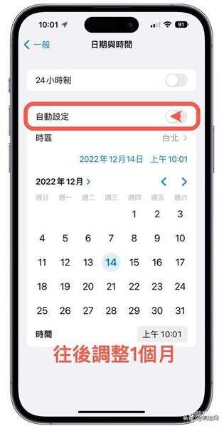 步骤 2. 直接将日期与时间「自动设置」关闭,直接将日期调整到一个月后,举个栗子是11月15日,往后调整一个月就是12月15日,设置完成后点选左上角「通用」完成设置。