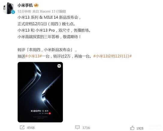 就在今天,小米官宣12月1日要举办小米13系列新品发布会,虽然此前骁龙8Gen2芯片的“首发”被vivoX90Pro+给抢了,但这部手机的正式开售日期为12月6日,不出意外的话小米13会拿下骁龙8Gen2芯片的“首销”,大概率会在12月3日之前正式出货。