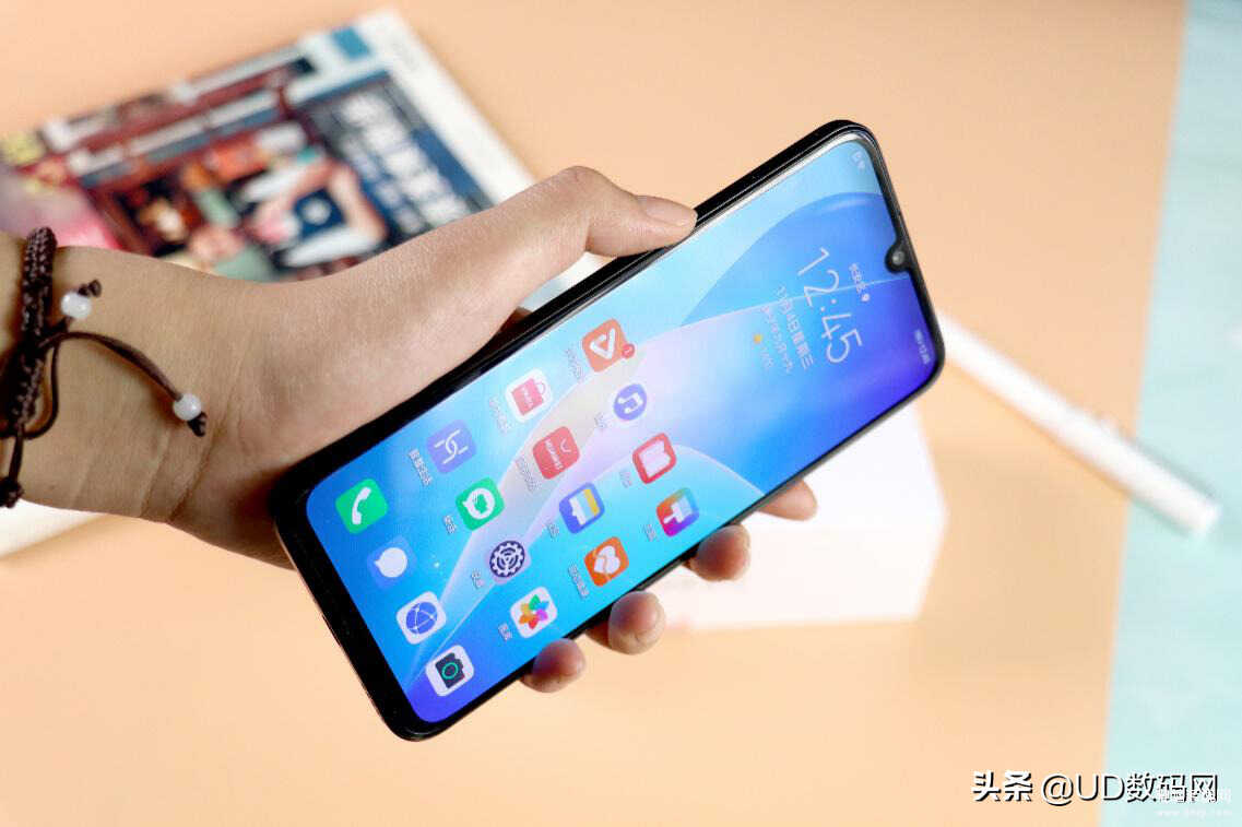 手机正上方前置水滴摄像头,不仅仅可以进行自拍,同时也是面部解锁的摄像头。手机支持了屏内指纹解锁,两种解锁方式也带来了不同场景的体验。