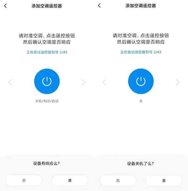 5.选好空调进入开关界面后就一个个试吧,最好站空调底下试,越近感应越好,远了有可能感应不到或感应到别的空调设备。