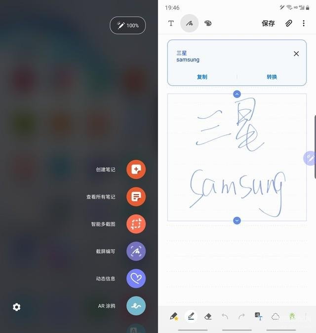 三星的生产力基因,配合S-Pen悬停手势的操作,足够应对日常的轻度文字工作。例如在三星笔记中将手写体转换为文本,还能导出为包括 Microsoft Word 在内的多种格式,息屏状态下也可以直接用S-Pen在屏幕上书写。