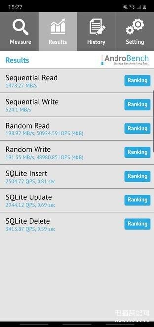 Androbench测试结果:三星Note 10+ 5G连续读取1478.27MB/s,连续写入524.1MB/s,随机读取198.92MB/s,随机写入191.33MB/s。