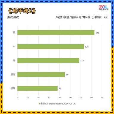 本次测试我们新加入了《地平线5》,作为本代旗舰产品,我们测试了索泰GeForce RTX3080 12G6X PGF OC在4K分辨率下,不同画面预设的帧数表现。可以看到在极端和低画质下,帧数差距将近两倍。