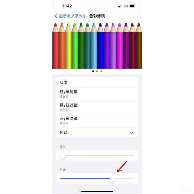 2、在设置的辅助功能中,找到显示与文字大小,点进去打开色彩滤镜,将色彩强度拉到最左边,色调拉到三分之二处左右,这能明显改善发黄的现象。