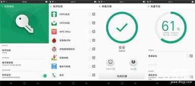 ◆“程序加密”这个功能非常不错,初次使用要先设置加密方式,有“图案、数字、和字母数字混合”三种加密方式,设定好密码后,就可以添加需要加密的软件应用了,防止自己的隐私泄漏。病毒扫描支持“快速扫描和全盘扫描”两种模式,依个人所需选择即可。电量节省选项非常丰富,有“普通省电、超级省电、低电量自动启动和电量提醒”三个常用选项,菜单最下面时“耗电详情”查询,可以随时关注手机的耗电情况。