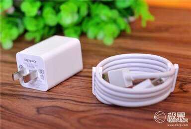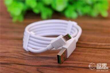 ◆介绍完手机,再来说一下配件。电源适配插头和 数据线接口处都是采用绿色作为配色。这和OPPO的包装盒的颜色搭配是一样的,绿色象征生命力,搭配OPPO独家的低电压高电流VOOC闪充技术,不仅保证了安全性,还极大的减少了充电过程中手机发热的问题。电源适配器的输出规格是5V/4A 。电源线也与传统的电源线有所不同,传统的电源线插头楚是5个触点,而OPPO R7S的电源线是7个触点,多出来的两个触点应该是为了更好的保证充电时的大电流通过。通过上面VOOC闪充功耗测试视频看得出在实测中,给OPPO R7S 充电时,最大的电流达到了19W。这就是1个小时左右就可以把3070mAh电池充满的核心原因了。附带的白色耳机,与手机比起来难免有些廉价,但是,有总比没有要好吧。