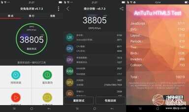 ◆OPPO搭载了高通骁龙64位真八核616处理器,主频在1.5GHz,从跑分来看,38805的分数也是中规中矩。这款处理器定位于中端处理器,采用八个Cortex-A53架构核心,集成了Adreno 408图像处理器。游戏运行方面非常流畅,在狂野飙车8 游戏中,切换至主界面,打开手机淘宝应用,丝毫没有卡顿现象,游戏、应用可随意切换。OPPO R7S搭载的Color OS V2.1版本在优化方面还是非常显著的,这也少不了3G运行内存的功劳。HTML5 的测试达到了16019分值,浏览网页不会有卡顿现象。系统偶有应用闪退情况,也在推送的“系统更新安装包”里面解决了。