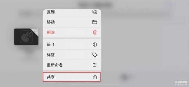 4、在库乐队的最新项目中找到刚刚拷贝过来的铃声,然后长按铃声,会跳出很多选项,下滑找到并点击【共享】,注意不同的系统版本显示有所不同;