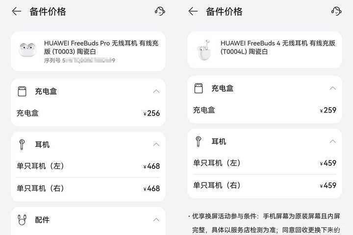 从实际的价格来看,如果没有丢失无忧服务,当出现耳机丢失情况之后,配一个华为FreeBuds Pro单只耳机需要468元,而华为FreeBuds 4需要459元,按照现在的价格几乎真的等于整套耳机一半的价格了,确实会带来一些压力。但如果有了丢失无忧服务,那就变成234元另加79元,能省不少钱。