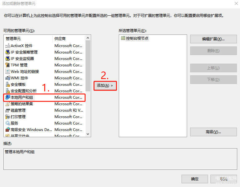 3、添加或删除管理单元,在左侧找到并点击本地用户和组,然后点击添加即可