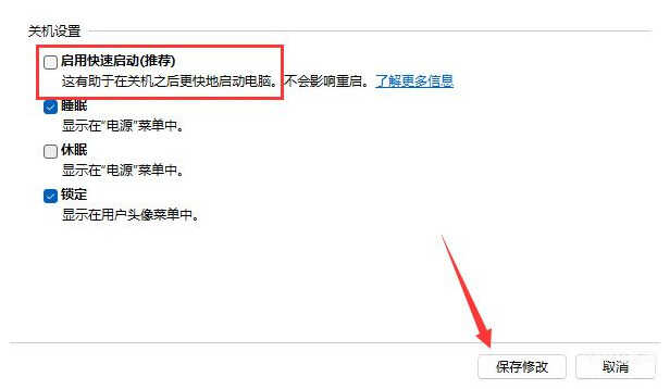 4、最后将“关机设置”中的“启动快速启动(推荐)”前面的√取消即可。