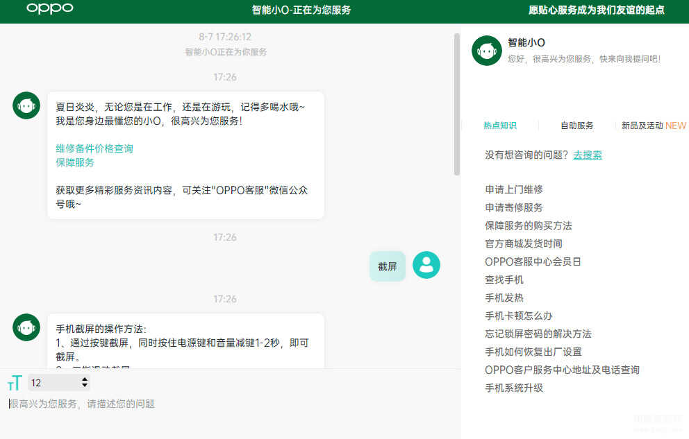 此外,OPPO还通过简化入口操作、优化服务流程等方法减少用户时间及精力成本,全面提升服务质量及效率。更有智能化服务全面覆盖线上渠道,小欧智能客服7*24小时在线,可实时解决大部分用户的问题解答需求。例如,在OPPO官网,找到在线咨询入口,在对话框输入“截屏”,就能立刻收到小欧智能客服提供的操作方法的详细教程。相信有了智能化服务和贴心人工服务的加持互补,解决用机问题,不再会是OPPO用户的难点。