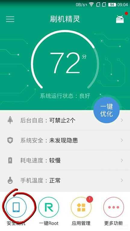 2.打开刷机精灵点击安全刷机,其他的一键优化不用管它。