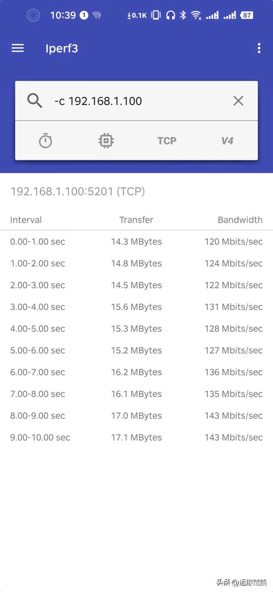 在客户端上使用同样的方法进入到iperf3里,输入"-c 服务端ip地址",比如"-c 192.168.1.100",键盘确认,这样就可以看到我们的传输速率(Bandwidth)了。除此之后,也可以通过与电脑上的iperf3搭配测试网络速度,感兴趣的朋友可以自行尝试一下。