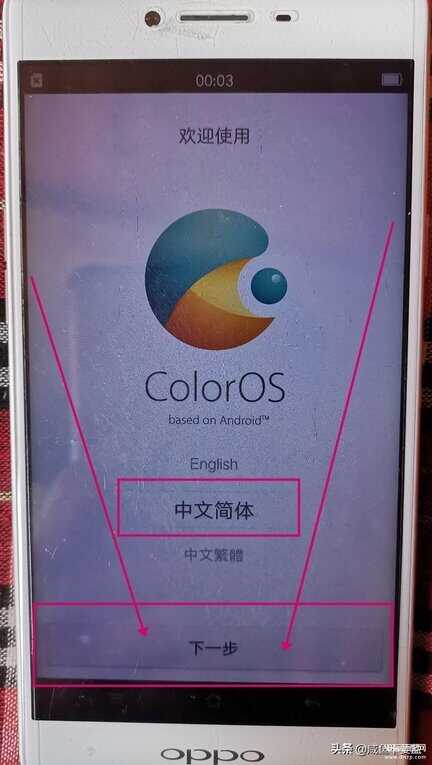 步骤5.出现“请选择语言”界面,松开“电源键”和“音量减键”。根据自身需要选择自己的语言,我这里选择“简体中文”为例!点击“简体中文”。