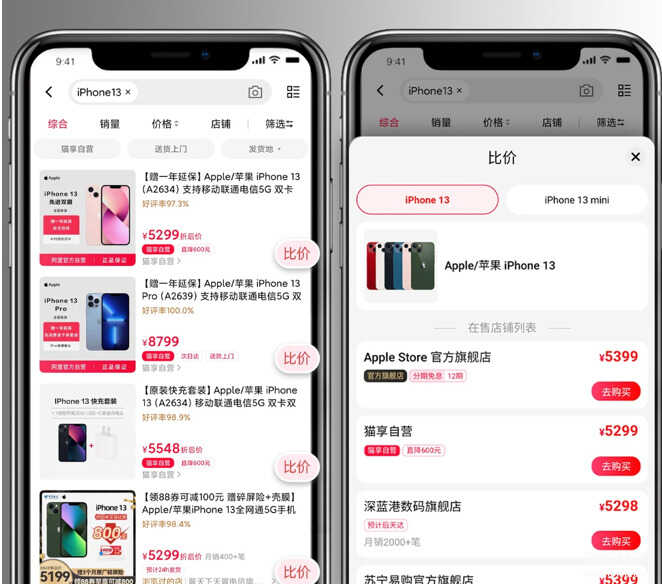 记者体验发现,在新版天猫App搜iPhone13,右下角会出现“去比价”按钮,点击能显示不同店铺的价格,直观查看最低价商品。此外,还能查看好评率、分期免息政策、发货时间等信息,方便线上选购决策。