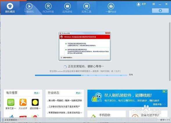 2.第二步把手机的usb调试模式打开,插入数据线连接电脑,多等一会,因为第一次连接手机刷机精灵需要搜索驱动,连接的可能会慢一些,如果手机出现什么提示一路开绿灯,同意 同意 还是同意。