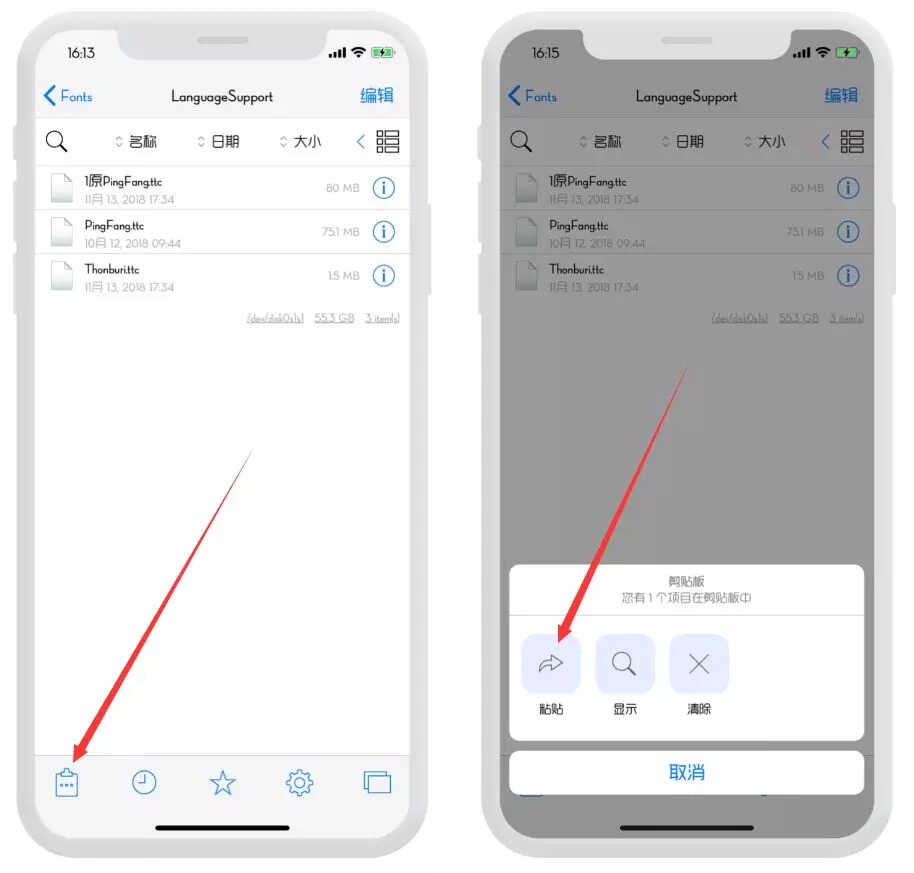 选择进入对应的文件夹,例如:Core文件夹,进入后点击左下角的粘贴按钮,选择粘贴替换所有文件,其余两个CoreAddition与CoreUI文件夹以同样的方式替换文件,返回主屏幕手动重启手机即可完成修改。