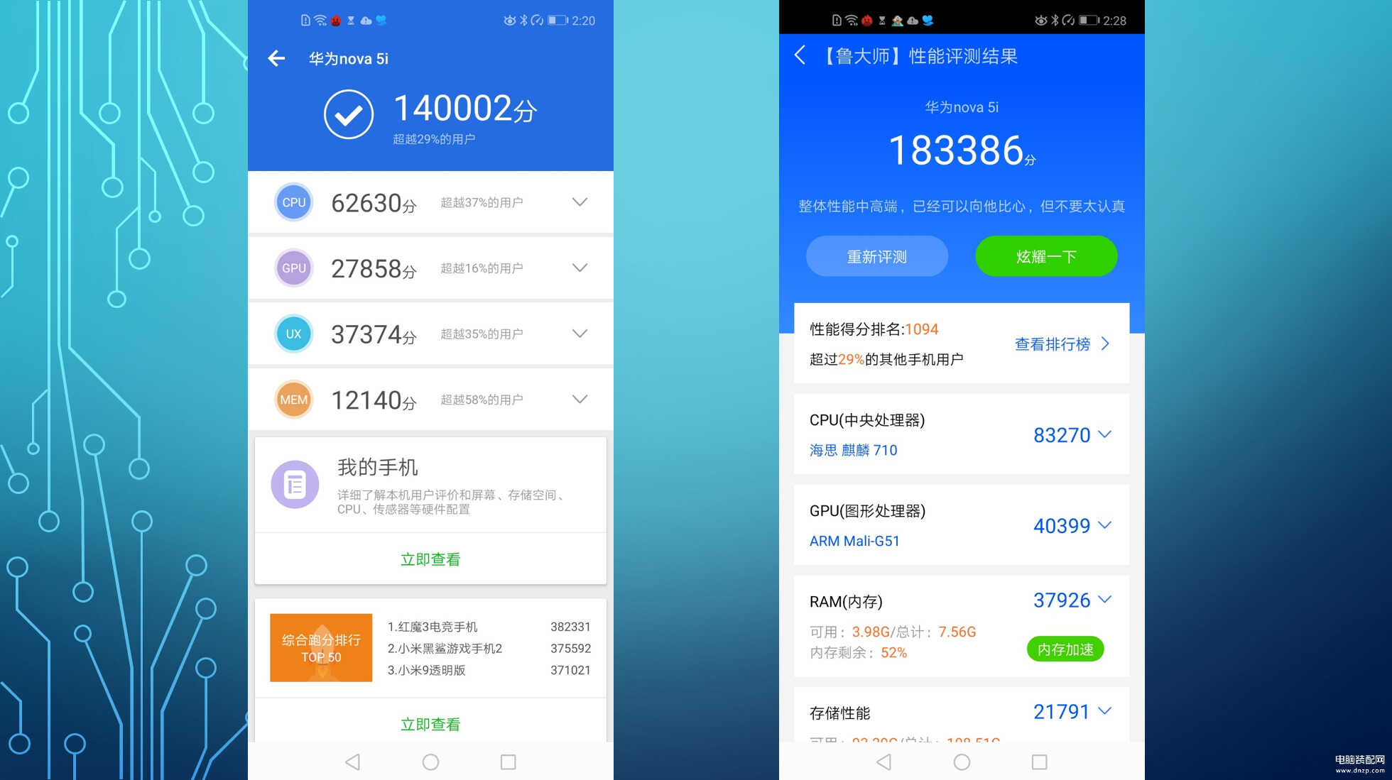 nova 5i采用最高8+128GB的内存组合,Kirin 710+GPU Turbo优化,EMUI 9.1,日常使用非常流畅。