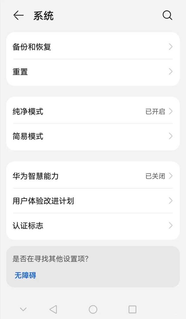 不得不再次摸索起来,找到设置—系统,下滑看到一个“华为智慧能力”,点击进去关闭,我现在是只要有华为智慧字样就要瞅一眼,通通关闭了。