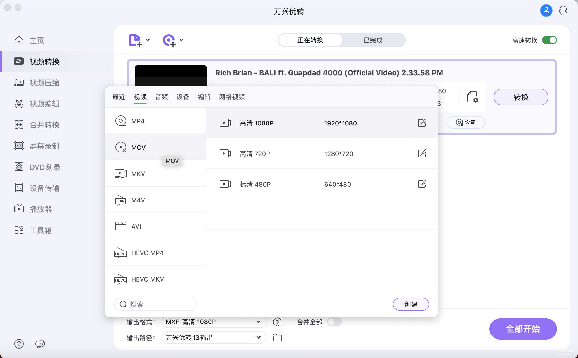将MXF文件添加到软件界面后,点击输出格式选项,从“视频”标签中选择MOV作为输出格式。你可以在右边控制输出视频的质量。