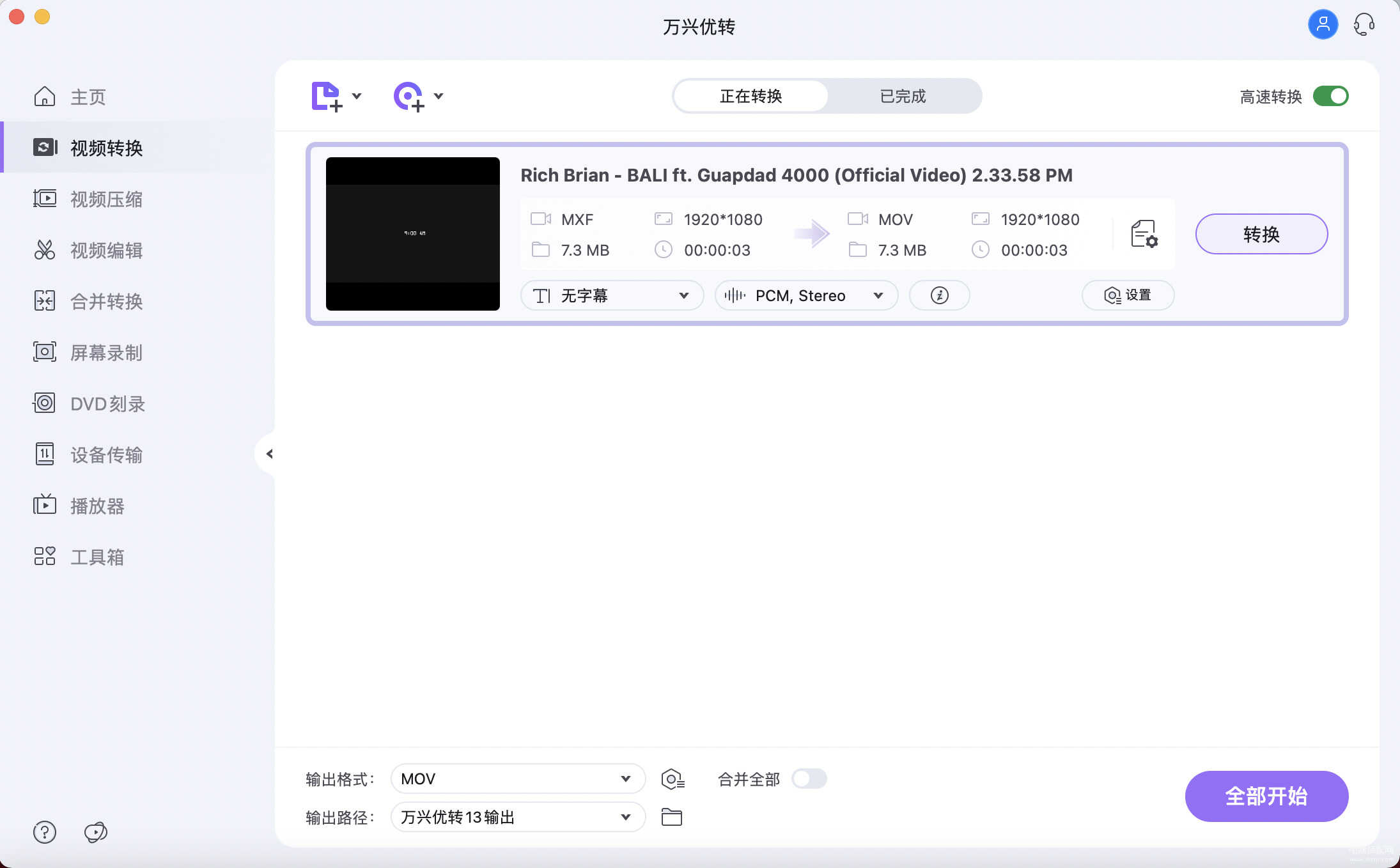 最后,点击转换按钮开始MXF到MOV的转换过程。如果你是上传的批量文件,可以点击右下角的全部转换一次性完成所有工作。