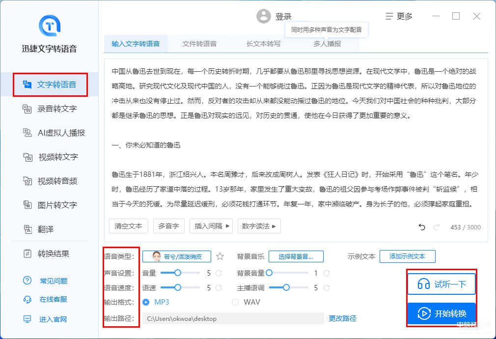 但是会比较死板,只有单一的效果,想要专业和生动的话,我们倒是可以选择“迅捷文字转语音”,原因是它里面含有海量音色可以供我们选择,同时我们还可以根据需求添加背景音乐,以及能根据情境来控制主播的语调语速,这种操作能增添更多的奇妙效果,带来不一样的感觉。