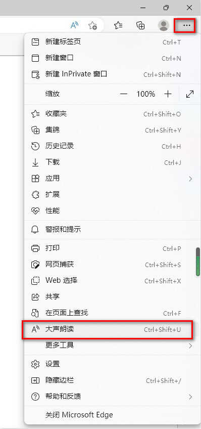这是电脑自带的浏览器,若是想要将内容一一读出来,里面有我们所需要的朗读功能,首先,将文件打开,然后点开右上角的三个点,或者使用【Alt+F】的快捷键,之后选择下方列表的大声朗读功能,软件就会将文件朗读出来,录音保存就大功告成啦。