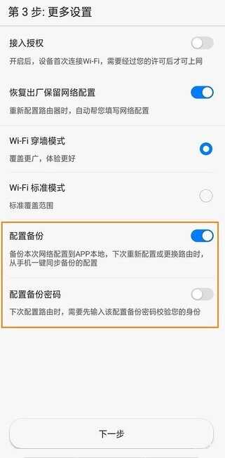2. 使用“华为智能家居”APP操作路由器首配,在第三步“更多设置”页面中,“配置备份”保持默认开启。