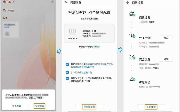 配置新路由时,打开“华为智能家居”APP,登录与旧路由绑定的华为帐号,APP即可自动检测到原路由器的“配置备份”,点击使用该备份可实现一键配置。
