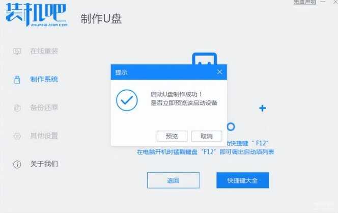 5、u盘启动盘制作完成时,我们可以选择预览点击进入bios设置的快捷键,也可以点击取消。