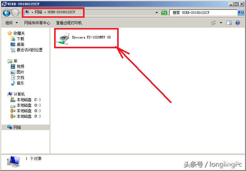 共享设置完成后,就要以通过其他电脑来连接本台电脑的打印机来实现打印了,在其他电脑上设置,首先我们要记住主机电脑的计算机名称或者IP地址,在其他电脑上输入主要的IP地址或者计算机名,如本例的\\USER-20180122CP就可以看到共享打印机了,双击打印机就可以完成连接和驱动的自动安装。