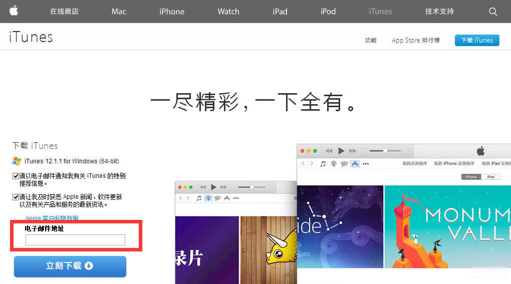 在下载iTunes介绍页面左侧,电子邮件地址栏目输入已经注册过的Apple ID,然后点击立即下载